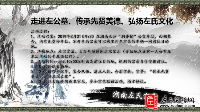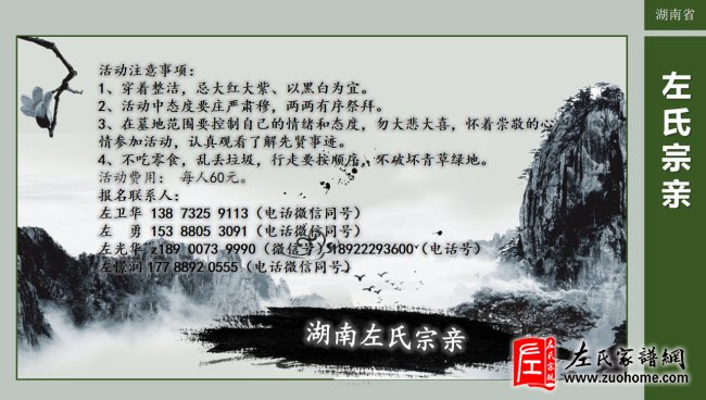 清明节是二十四节气中最具人文历史的节日,人们在清明节怀念逝者,祭祀先祖,缅怀先烈。为了纪念这个有着深远意义的日子,我们组织湖南宗亲前往左宗棠墓祭拜。 二、活动目的: 通过这次扫墓活动,团结更多的左氏宗亲,培养氏族自信心、自尊心和氏族自豪感,同时学习左氏先贤辉煌灿烂的文化,增强自身修养,促进宗族兴盛。 三、活动主题: 走进左公墓、传承先贤美德、弘扬左氏文化 四、活动时间:2019年3月31日星期日 五、活动地点:左宗棠墓 六、活动参与人:湖南左氏宗亲、及各地自愿前往的左氏宗亲。 七、活动流程: 1、活动召集:2019年3月31日9:30 在湖南长沙“洞井铺”公交车站,西侧集合,内有免费停车位。不开车的宗亲可以乘坐开车宗亲的车辆一同前往目的地。 2、活动地点:左宗棠墓、天际岭隧道附近农家乐(详细地点提前一天公布在本次活动的专属微信群)。 3、活动时间:当天10:00准时出发前往目的地,迟到的宗亲自行安排前往。 4、10:30到达目的地。 5、12:00前祭拜完毕,集合队伍、清点人数、合影留念。 6、12:30到天际岭附近农家乐,参加宗亲联谊活动,酒水畅饮。 八、活动注意事项: 1、穿着整洁,忌大红大紫、以黑白为宜。 2、活动中态度要庄严肃穆,两两有序祭拜。 3、在墓地范围要控制自己的情绪和态度,勿大悲大喜,怀着崇敬的心情参加活动,认真观看了解先贤事迹。 4、不吃零食,乱丢垃圾,行走要按顺序,不破坏青草绿地。 九、活动费用: 每人60元。 十、报名联系人: 左卫华 138 7325 9113(电话微信同号) 左 勇 153 8805 3091(电话微信同号) 左光华 z 189 0073 9990(微信号)18922293600(电话号) 左憬润 177 8892 0555(电话微信同号)