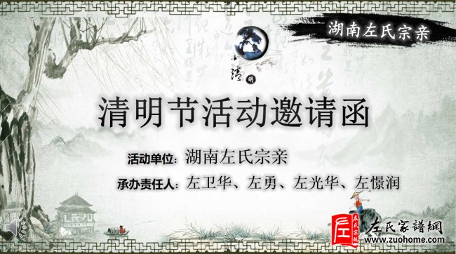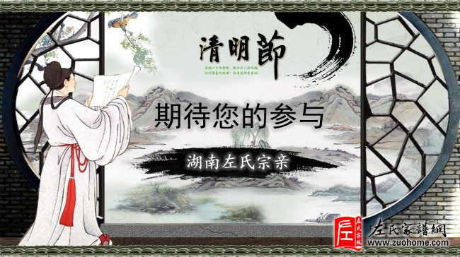 主持词: 盛世祭祖钟鼓响,光前裕后谱华章。 Powered by 公元2019年,时值清明,湖南左氏族人恭集左公墓,共同祭祀功德前辈。 传承先贤美德、弘扬左氏文化,“立德、立言、立行”这是我们左氏家族所有族人的共同心愿和情怀。在这庄严而隆重的时刻,我们首先要虔诚的感谢我们的先祖,凭着他们的卓越智慧、高尚的品德和坚强意志,使得我们的家族日渐繁荣兴旺! 同时,我们也由衷的感谢为这次祭祀活动所付出众多辛劳的宗亲及长辈。 祭祀开始: 1、鸣炮! 2、集体默哀一分钟。 3、请“左宗棠第五代嫡长玄孙”左文龙宗亲介绍左公生平事迹。 4、请各位宗亲代表,两两向左公进献鲜花。 5、礼毕,鸣炮! 6、祭祀结束,集合清点人数,并合影留念。 请 左憬润宗亲 带领大家宣誓: 传承先贤美德、弘扬左氏文化