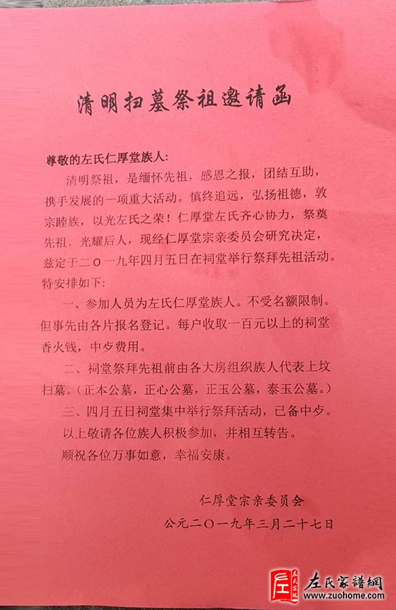 尊敬的左氏仁厚堂族人: 清明祭祖,是面怀先祖,感恩之报,团结互助,携手发展的一项重大活动。慎终追远,弘扬祖德,敦宗睦族,以光左氏之荣!仁厚堂左氏齐心协力,祭奠先祖,光耀后人,现经仁厚堂宗亲委员会研究决定,兹定于二O一九年四月五日在祠堂举行祭拜先祖活动。 特安排如下: 一、参加人员为左氏仁厚堂族人。不受名兀限制。但事先由各片报名登记。每户收取一百元以上的祠堂香火钱,中歺费用。